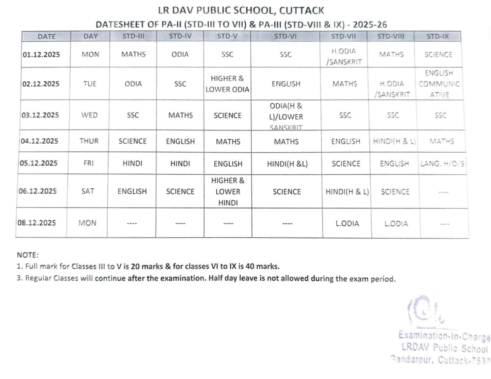 DATE-SHEET OF PA-II (STD: III-VII) & PA-III (STD: VIII, IX): 2025-26